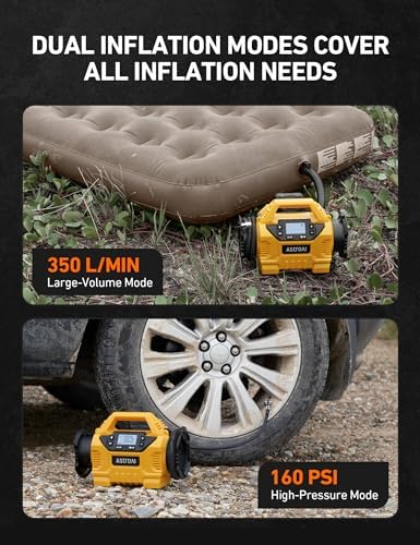 Ultra-fast Inflation & 20 Mins Continuous Use: With dual metal motors and a metal cylinder, the car tire pump can continuously work for up to 20 minutes. Large-volume mode provides a maximum inflation rate of 350L/min, quickly inflating items. High-pressure mode pumps up to 160 PSI, inflating a flat tire from 0 PSI to 36 PSI in 5 minutes. Compatible with cars, bikes, sedans, and mid-sized SUVs. NOTE: This pump is incompatible with heavy-duty trucks.