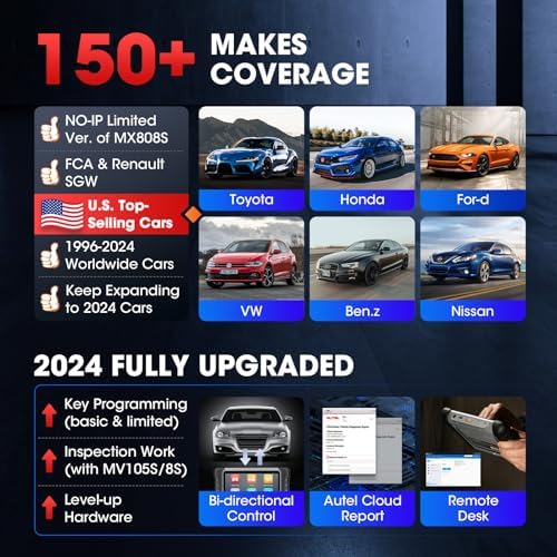 🔥🔥🔥【2024 NEW VERSION OF MX808 MK808, SAME AS MK808BT PRO】Big Surprise! Autel has upgraded the MK808 to the 2024 MK808S. With the same cost, you are experiencing 5X faster diagnostics and 150 wider car coverage from 1996-2023-2024. Function as MK808BT PRO MK808K-BT MK808Z-BT, the pro-level MK808S enjoys powerful CPU ROCKCHIP RK3566, improved Android 11, larger 4+64GB, 5G & 2.4 GHz Dual WiFi, newly added Wi-Fi Print, Bi-directional Control and FCA Autoauth for Chrysler Jeep Dodge Fiat etc.