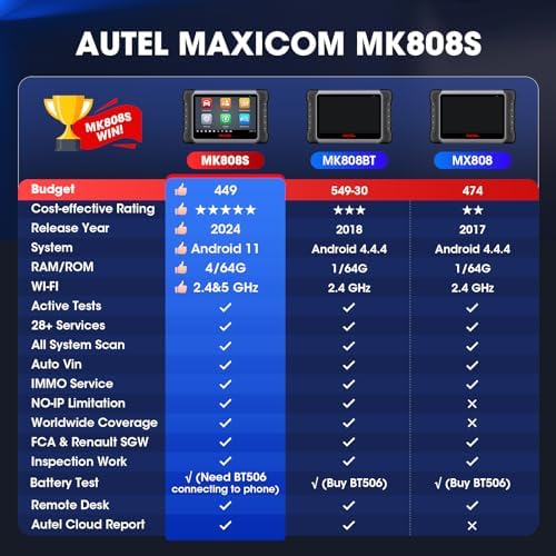 【WHY MK808S STANDS OUT】✅Autel’s escaner automotriz professional, MK808S, provides the same funcntions as the MK808BT PRO at a lower cost. MK808S not only helps you save on subscription expenses (124.5 USD vs. 150 USD) but also ensures flawless utilization of all functions even without updates. ✅As Autel’s flagship model, MK808S is the upgraded version of the old MX808. It covers global coverage for 150 car brands, making it a versatile and cost-effective choice.