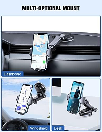 【Multi-function Phone Mount】: This phone mount for car can be mounted to your car dashboard, windshield, table or other flat surface, all places work perfectly. Features a one-button release system that enables you to release your phone with just one hand.