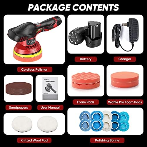 🎁What You Will Get: 1 * Cordless Buffer Polisher, 2 * Battery, 1 * Charger, 1* Loop Backing Plate, 2* Foam Pads, 2* Waffle Pro Foam Pads, 2* Knitted Wool Pad, 10* Polishing Bonnet , 10* Sandpapers, and you get the LSA (Lifetime Service Agreement), available at Avhrit.