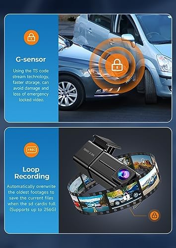 🚘【Seamless Loop Recording & G-sensor】Loop recording overwrites the oldest unlocked file when card is full. Triggered by G-Sensor, the dash cam front will automatically detects sudden vibration or shock and locks the video without being overwritten. Adopt real-time storage TS stream technology for faster storage, avoid damage and loss of video.