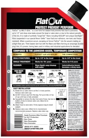 INTENDED FOR: FlatOut tire sealant is perfect for ATV’s, UTV’s, Golf Carts, Dirt Bikes, and Side by sides