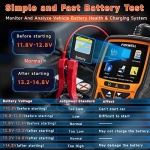 【More Accurate 12V Battery Analyzer】Displays multiple battery conditions, such as SOH (State of Health), SOC (State of Charge), Voltage,Current, Rating and analysis results; works on regular flooded, AGM flat plate, AGM spiral and GEL batteries with 100 to 2000 CCA. The cranking test for analyzing whether the starter motor is working properly. The role of the charging test is to check the status of the charging system to avoid damage to the battery due to overcharging or incomplete charging.