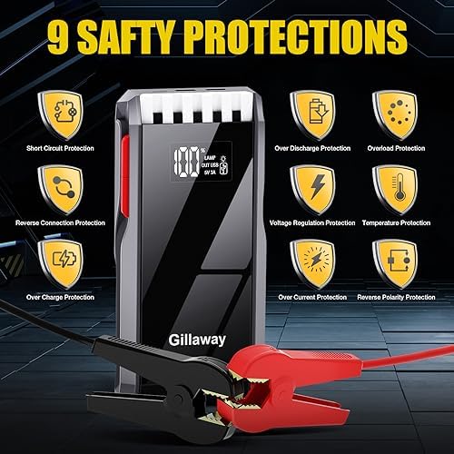 【Fashionable LCD display screen & hight-quality materials】: Gillaway Jump Starter adopted with ABS resistant fuel casing and Acrylic high transparent lens which is more durable than ordinary plastic material. also the full LCD screen shows precise remaining percentage of power and the status of the input or output, meanwhile its shiny LCD full screen appearance design adds a unique design sense.
