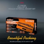 13-Piece E Torx socket set is include: E4, E5, E6, E7, E8, E10, E12, E14, E16, E18, E20, E22, E24 and 4-piece impact-grade adapter and reducer kit includes 1/4″(F) to 3/8″(M) – 3/8″(F) to 1/4″(M) – 3/8″(F) to 1/2″(M) – 1/2″(F) to 3/8″(M).