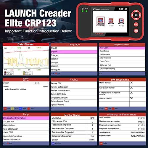 [4 in 1 Live Data Stream]–LAUNCH crp123 supports Generic OBDII Codes (P0, P2, P3 and U0); Manufacturer specific codes (P1, P3 and U1); Clear DTC codes and Turns off the MIL;Resets monitors; Provides Data Link Connector (DLC) location hints; Pending codes; Freeze frame data; Monitor and I/M readiness; Live PCM stream data; 4 IN 1 live data stream include the Engine Coolant Temperature, Long Short Fuel Trim, Throttle valve position,Fuel Tank Pressure,Engine RPM, Intake Ait Temperature and so on.