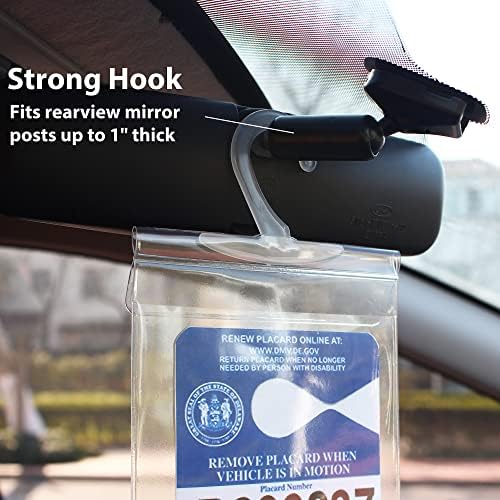 Handicap placard holder with built in large plastic hook fits multiple car rearview mirrors