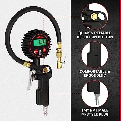 Pistol Grip Body Design: Molded out of high quality steel into a comfortable, ergonomic design with a fully integrated deflate button for easy and quick tire pressure tune-up and 14″ rubber hose with easy-clip air chuck for easy, one-handed inflation