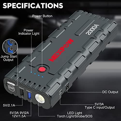 🚗【PORTABLE EMERGENCY POWER BANK】 Designed with 2 USB outputs (5V/3A)and (5V/2.1A), the quick charge 3.0 USB port can fully charge your cellphones, tablets, and other mobile devices at the fastest speed possible.🚗【LED FLASHLIGHT】The LED work light has 3 modes: Flash Light, Strobe Light, and SOS Light. This multi-purpose flashlight is great for camping, outdoors, indoors, emergencies, travel, etc.