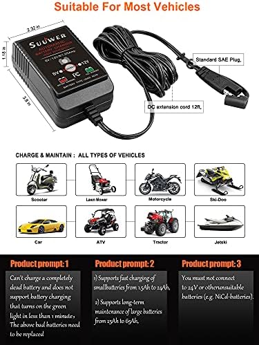 【2】Adapts to all kinds of 6V & 12V battery for car, motorcycle, lawn mower, atv, lawn tractor, truck, suv, boat, classic car, emergency batteries and more. (Note: If the battery power is lower than 3.6v, it is a bad battery and cannot be charged normally)