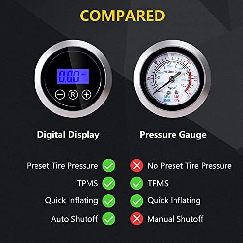 šćLED-LIGHTING AND COMPACT DESIGNć:This car tire inflator comes with the LED lights and accurate pressure gauge to help you be ready for nighttime emergencies. Coupled with the 11.5 ft power cord, both of the front and the rear tires will be fully taken care. Our car air pump is also compact and lightweight. GET pompe Ć©lectrique 100% SATISFACTION AND 1 FULL YEAR WARRANTY!