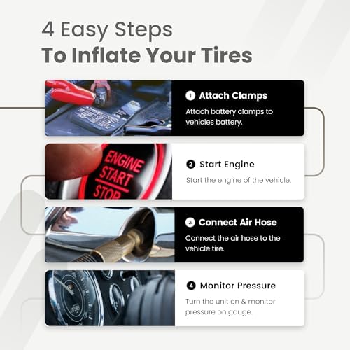 ON-THE-GO PERFORMANCE for VEHICLES, BIKES & SPORTS EQUIPMENT: Cars, Trucks, SUVs, Jeeps, Offroad Vehicles, 4x4s, Side-by-Sides, RVs, Motorcycles, Road Bikes, Mountain Bikes, Balls and Rafts. *Instructions: Attach the battery clamps to your vehicle’s battery and start the engine. Connect to a valve stem and turn the unit on. When required, use the included bicycle Presta valve adapter.