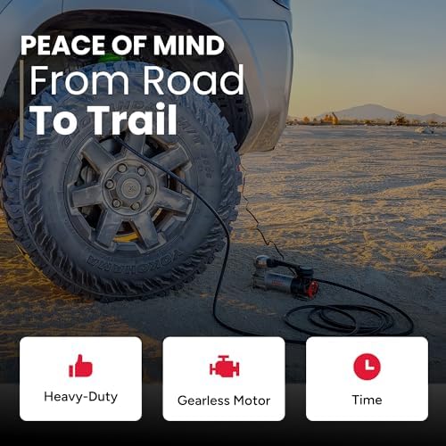 PORTABLE OFFROAD COMPRESSOR (Model: 88P, 120 PSI, 33″ Tires) – The 88P Portable Truck Air Compressor: Gear up for rugged trails with this robust 12V air compressor, designed with offroad enthusiasts in mind. Its heavy-duty, gearless motor and maintenance-free operation are perfect for tackling tough terrain. Ultra-compact and storable in its own carrying case, it’s an essential tool for any off-road adventure, combining reliability with convenience.